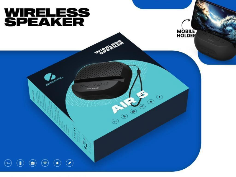 The Gadpro Air 5 Wireless Speaker offers versatile audio with a built-in mobile stand and FM radio. It features True Wireless Stereo (TWS) technology, allowing you to pair two speakers for a more immersive sound experience. Ideal for both music and hands-free use, the Air 5 combines convenience with quality in a sleek design.