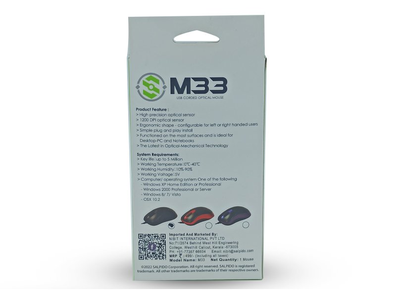 SALPIDO (M33) USB CORDED OPTICAL MOUSE 1200DPI Optical Technology Mouse, USB2.0
